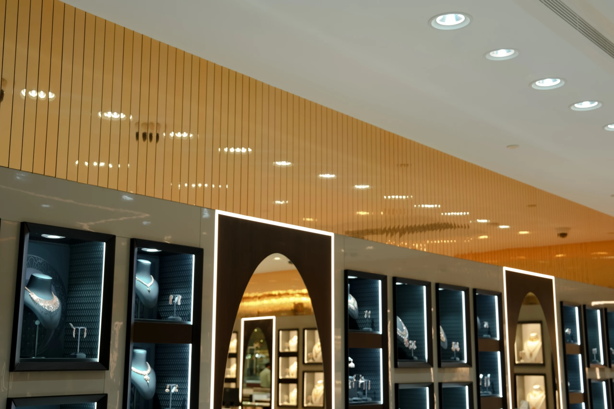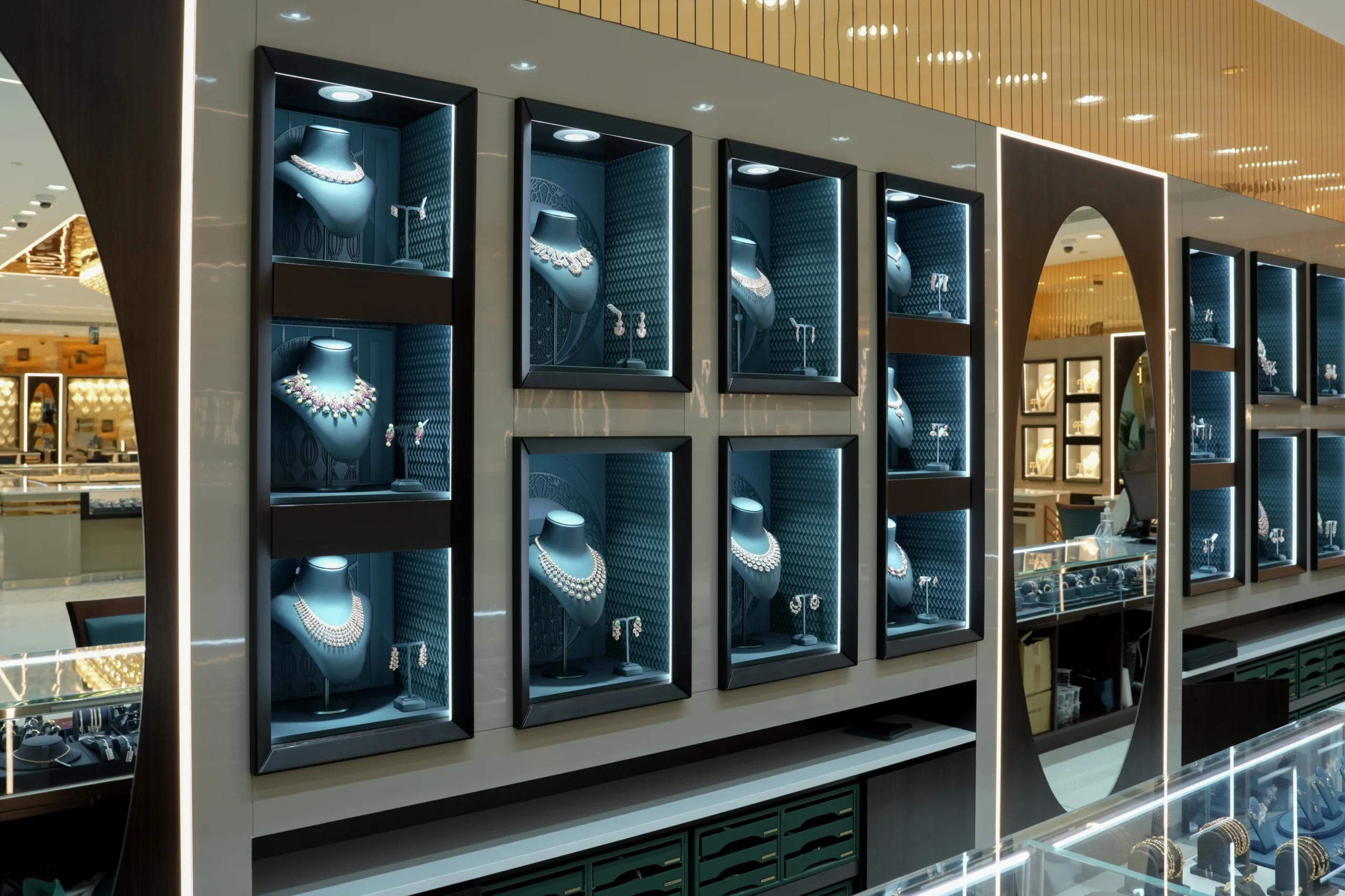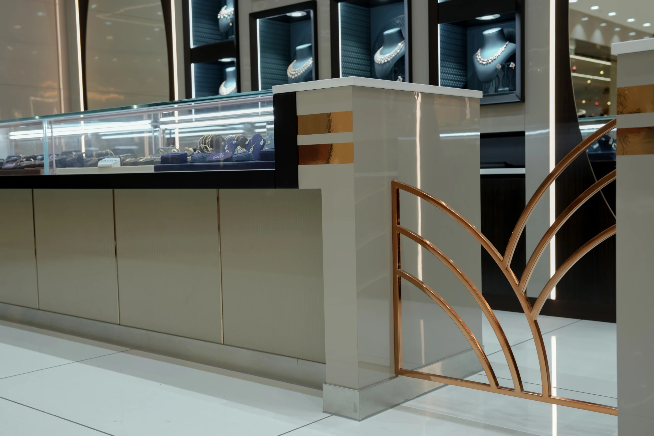 Bespoke jewellery showcases, integrated wall niches, and precision-engineered lighting systems are strategically positioned to enhance product visibility while reinforcing the brand’s premium identity. A sophisticated material palette—featuring high-gloss flooring, warm metallic finishes, and layered ceiling elements—creates depth, visual continuity, and a refined retail ambiance.