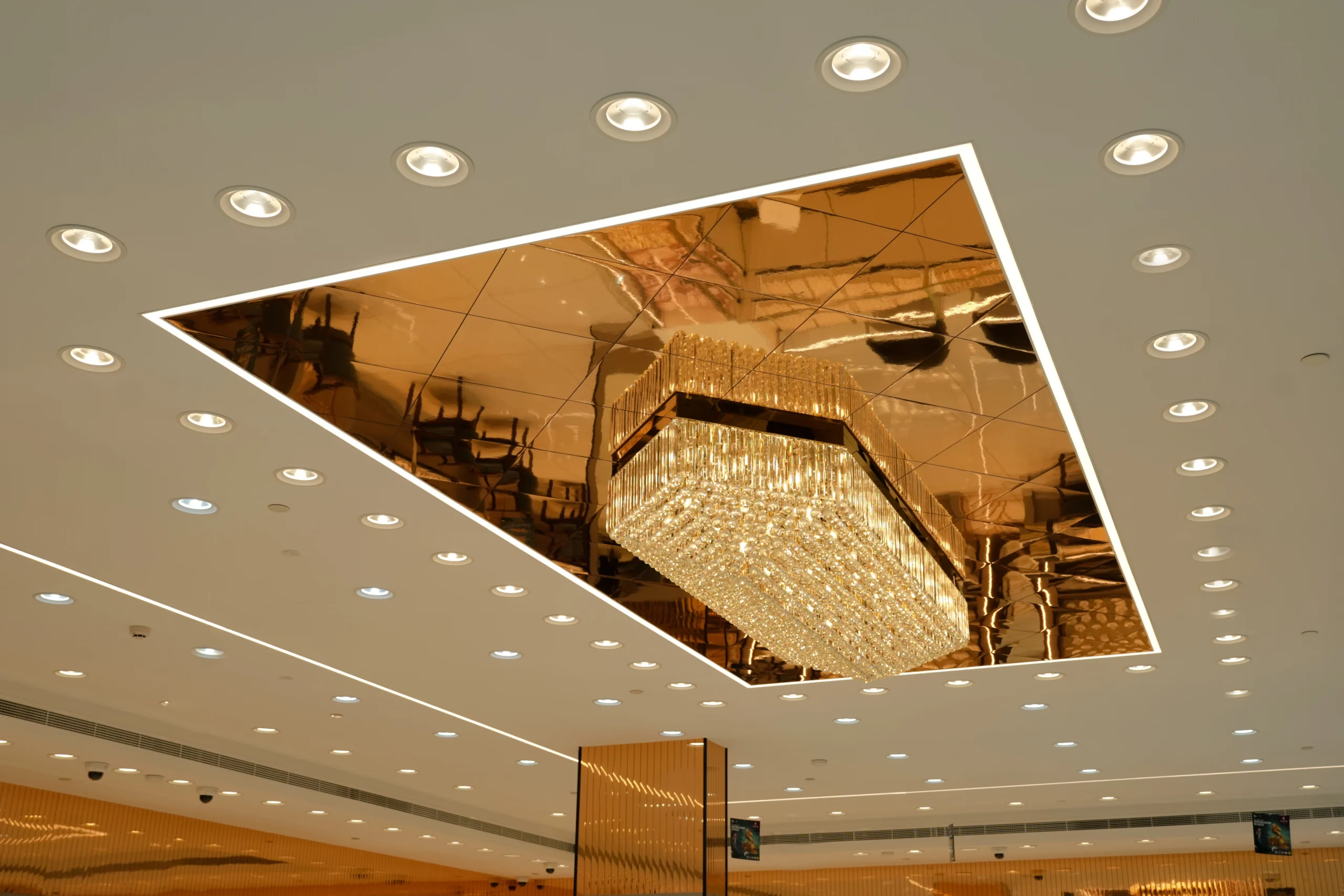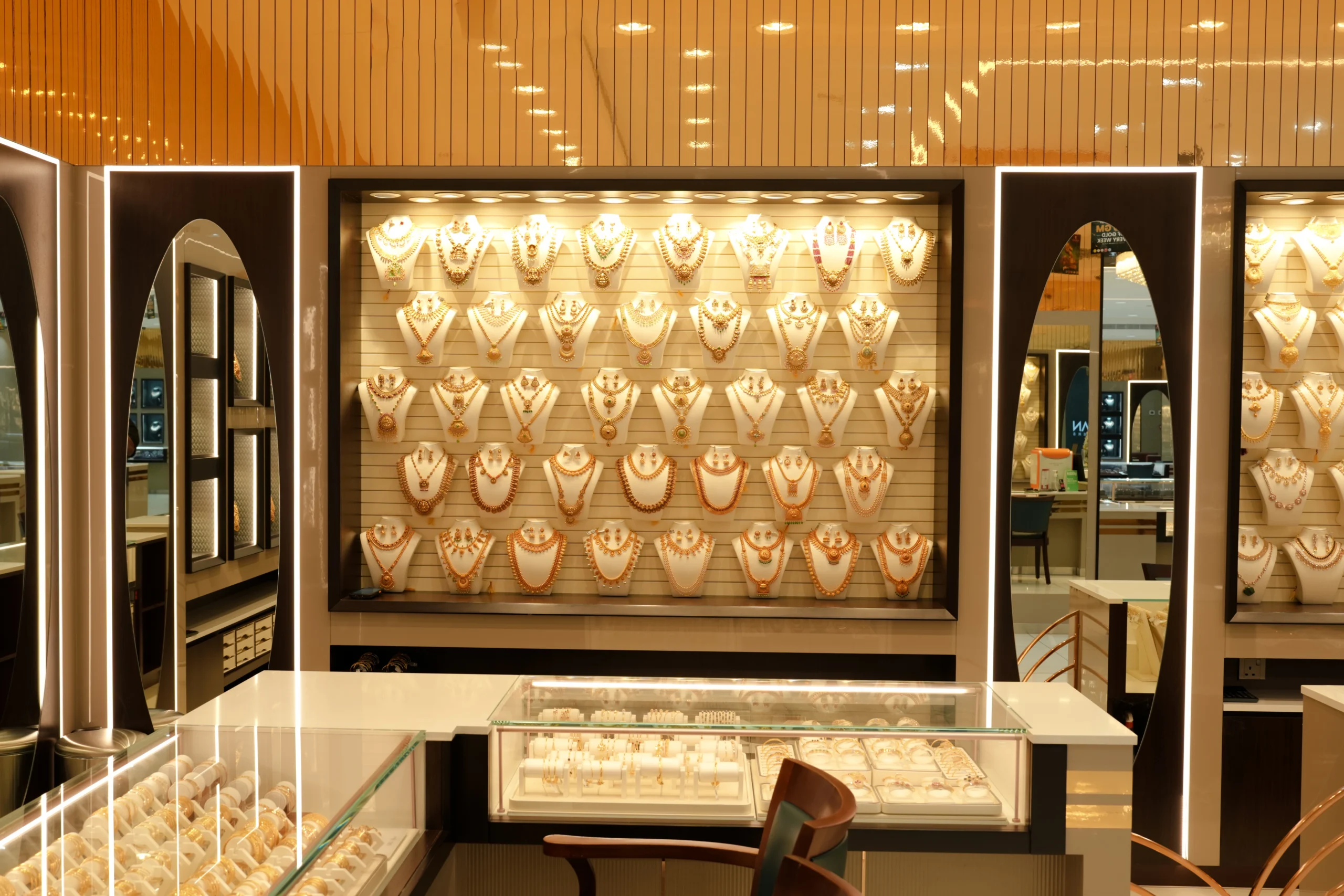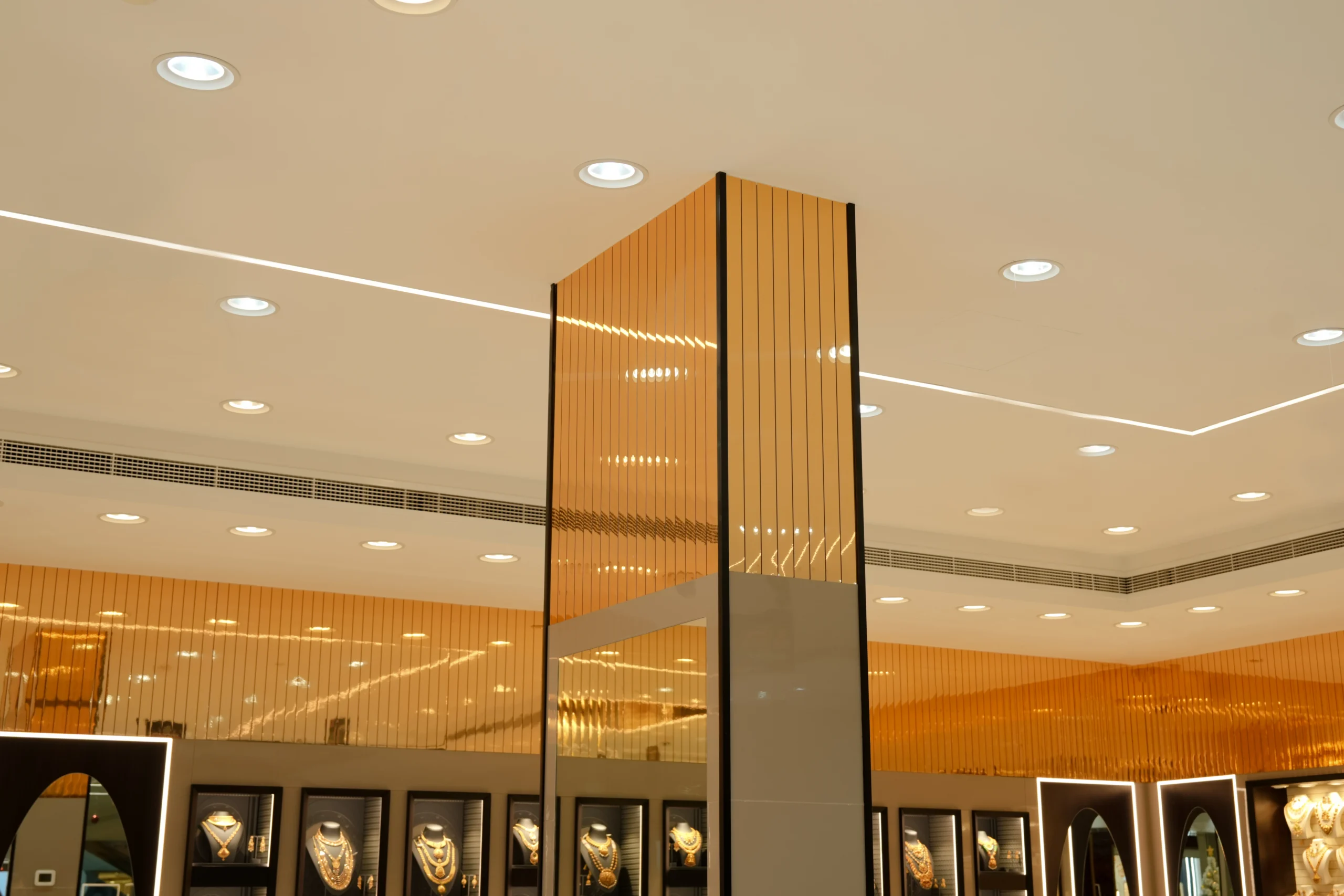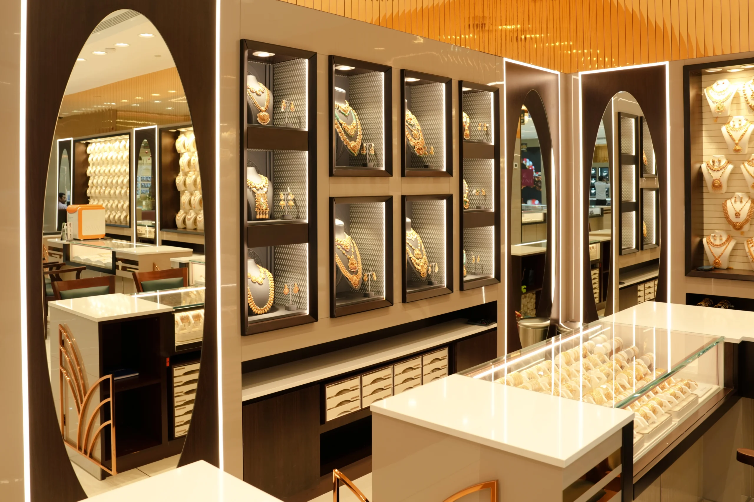 Bespoke jewellery showcases, integrated wall niches, and precision-engineered lighting systems are strategically positioned to enhance product visibility while reinforcing the brand’s premium identity. A sophisticated material palette—featuring high-gloss flooring, warm metallic finishes, and layered ceiling elements—creates depth, visual continuity, and a refined retail ambiance.